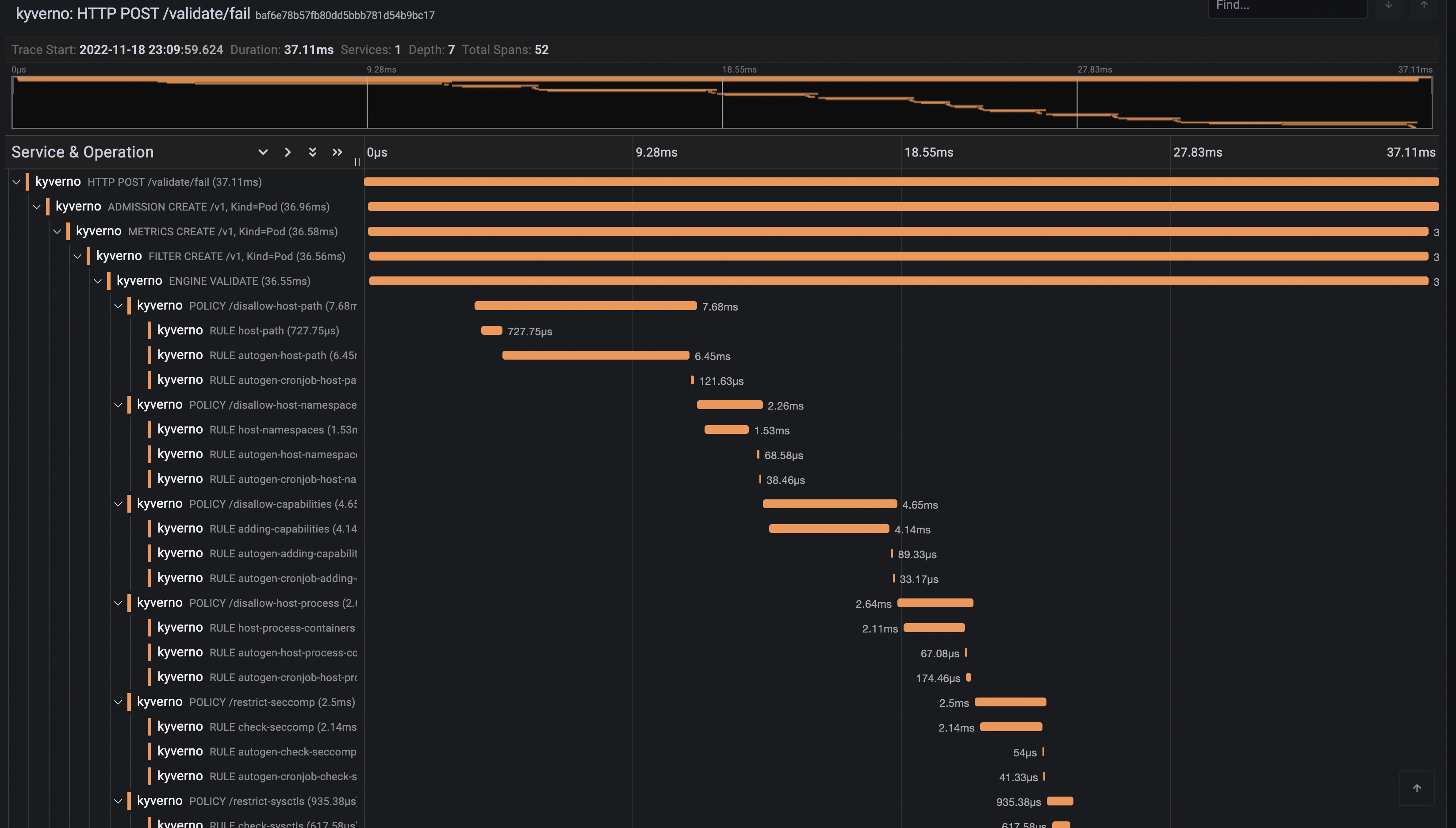 In the context of Kyverno, requests are usually sent by the Kubernetes API server to the Kyverno service during the admission phase. Kyverno receives and processes admission requests according to the configured policies. Every step in the admission pipeline and during the engine policy processing will produce spans. All clients (Kubernetes client, registry client and cosign client) have also been instrumented to produce client spans and transmit the tracing context on the wire.